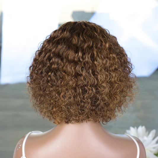 Highlight Honey Blonde Jerry Curly Bob Wig with Bangs | Non-Lace Front Human Hair