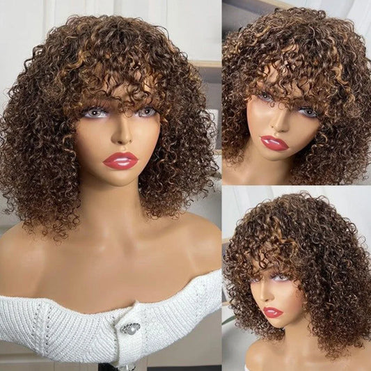 Highlight Honey Blonde Jerry Curly Pixie Bob Wig with Bangs | Full Machine Made Human Hair