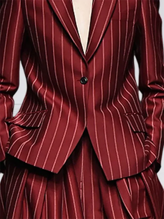 Women’s Striped Urban Commuter Blazer | Sophisticated V-Neck Lapel Silhouette | Elegant "Single Button" Formal Jacket | "Dignified" Polyster Blended Outerwear for Radiant Versatile Styling