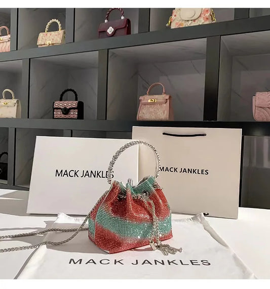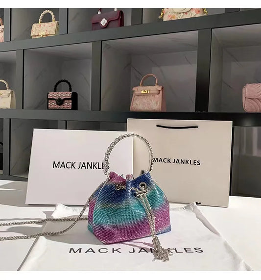 Fashion Metal Ring Handle Bucket Bag | Glitter Shiny Diamond Evening Purse | Luxury Rhinestone Wedding Party Clutch & Crossbody Bag (Model SHRF38)