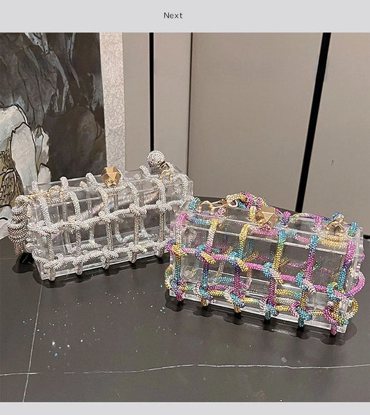 Diamond Clear Acrylic Box Evening Bag | Boutique Woven Knotted Rhinestone Purse | Luxury Party Clutch with Crystal Rope Handle & Metal Chain (Model 1201000988)
