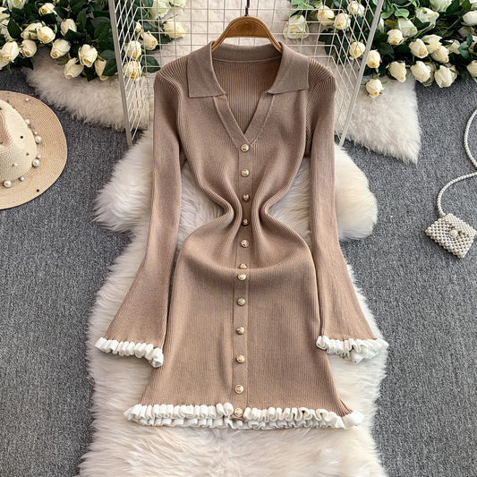 Slimming Knitted Mini Dress | Sophisticated Metal Buckle V-Neck Gown | Elegant "Bell Sleeve" Silhouette | "Dignified" High-Waist A-Line Skirt for Radiant Versatile Spring & Summer Styling