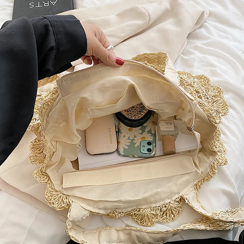 Crafted from a soft woven straw with a beautiful knitting pattern and a durable polyester lining, this bag feels lightweight and comfortable to carry. The unique hollow-out decoration and stylish circle shape give it an airy, trendy look, while the spacious design makes it an ideal accessory for any occasion. The interior is thoughtfully organized with a convenient cell phone pocket to keep your essentials neatly stored.