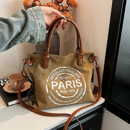 Large Women Stylish Crossbody Bag | Retro Canvas Tote Bag & Vintage Paris Stamp Print