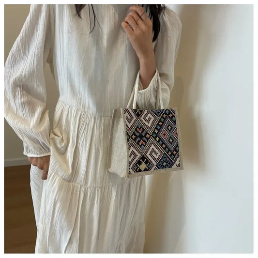 Large Ethnic Style Canvas Lunch Bag | Women’s Summer Bento Organizer | Insulated Mommy Commuter Purse & Retro Linen Tote
