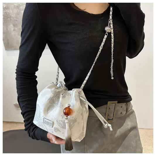 Polyester Chinese Style Pleated Bucket Bag | Soft Single-Strap Crossbody