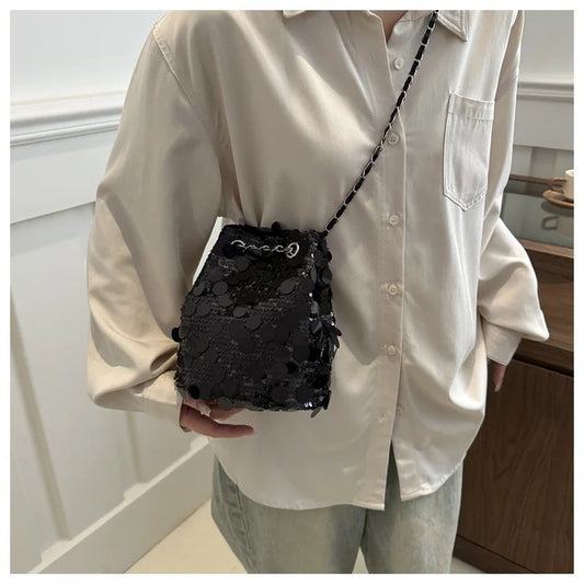 Sequin Chain Women's Portable Bucket Shoulder Bags | Retro Ladies Dinner Party Clutch Purse Luxury Design Female Crossbody Bag
