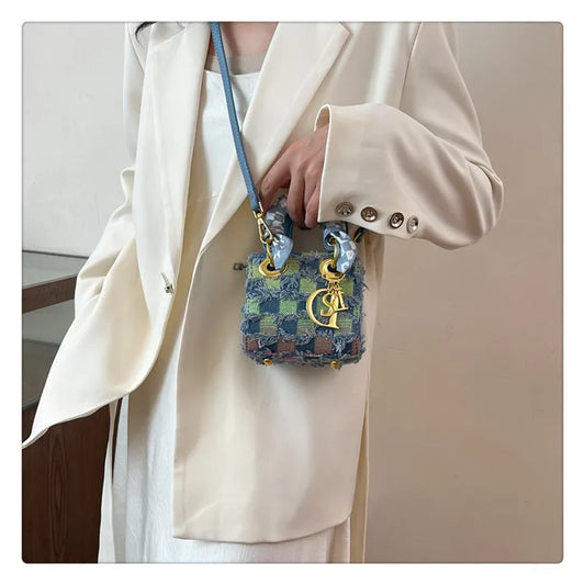 New Fashion Denim Silk Scarf Color Contrasting Mini Handbag | Single Shoulder Diagonal Cross Women's Bag