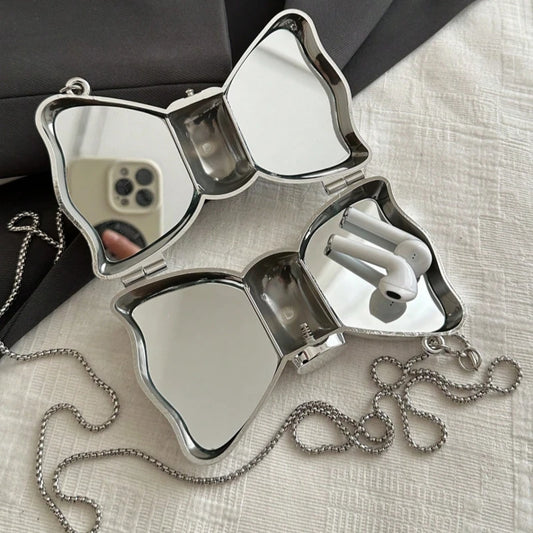 Personalized Fashion Mini Electroplated Silver Metal Bow Clutch | Shiny Cosmetic Chain Crossbody Bag & Coin Wallet (Minaudière)