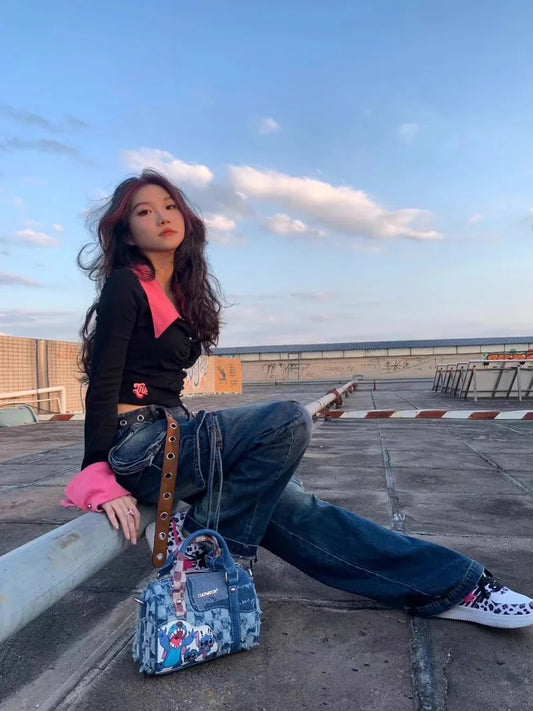 Disney New Cartoon Stitch Denim Shoulder Bag | Hole Splicing Crossbody Bag & Portable Pillow Bag (Casual Tote for Women)