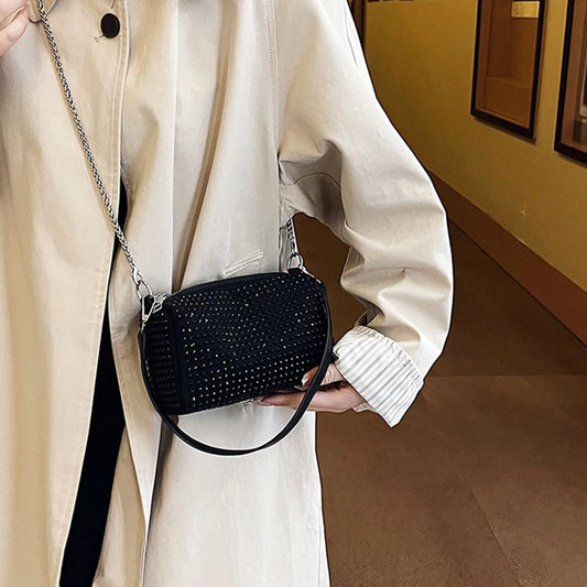ABS Pillow Shaped Bucket Bag | Moderate Hardness Allover Rhinestone Glitter Chain Crossbody