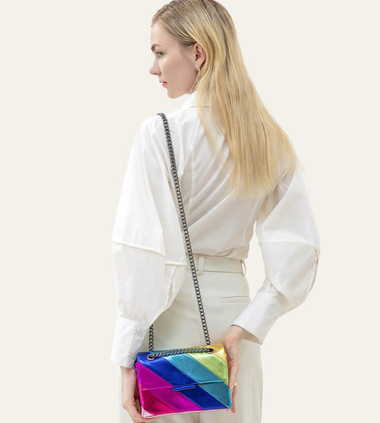 Women’s Metallic Rainbow Color Stripe Crossbody Bag | Fashion Vegan PU Leather Small Square Bag | Trendy Magnet Flap Cover Handbag with Metal Chain | Versatile Daily Shoulder Bag (Model CRP-2405042)