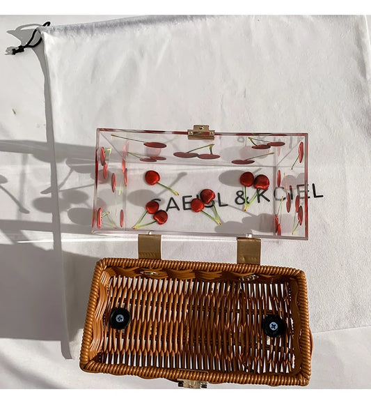 Transparent Acrylic Patterned Square Box Bag | Handmade Bamboo Woven Handheld Bag | Luxury Fashion Holiday Beach Handbag & Vacation Clutch