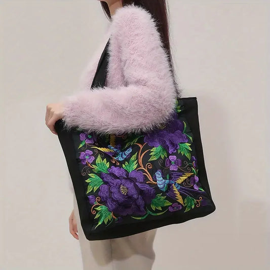 Ethnic Style Flower Embroidery Canvas Tote | Shoulder Bag & Large Capacity Handbag