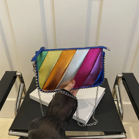 Fashion Trend Contrast Rainbow Splice Shoulder Bag | Designer Rivet Crossbody Handbag | Colorful Twill Chain Flap Bag