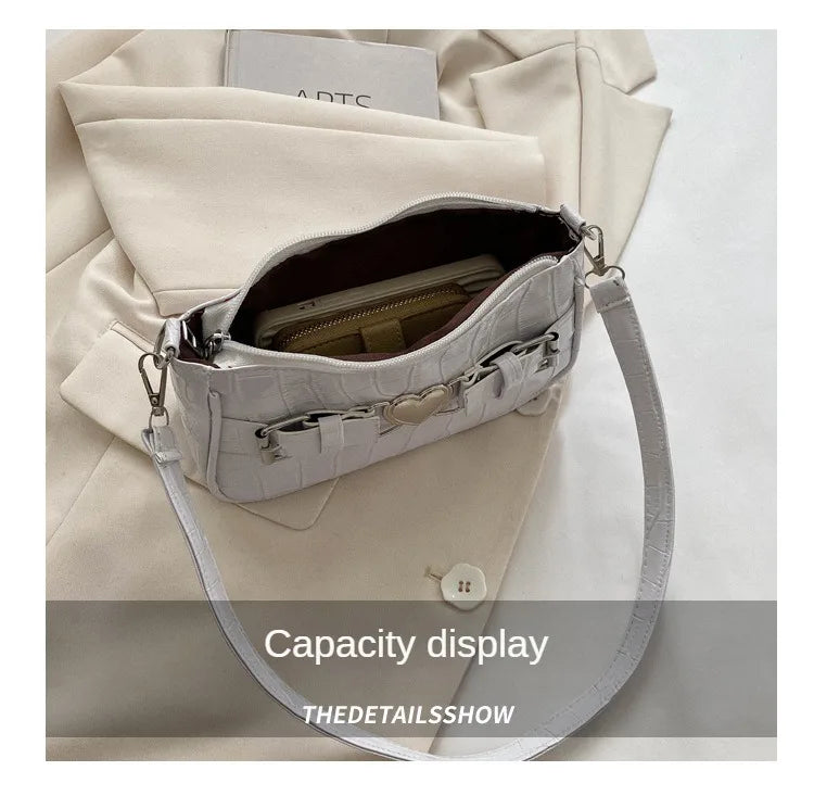 Step into Y2K fashion with our unique Women's Peach Heart Butt Leather Handbag! This eye-catching alligator pattern underarm shoulder bag features a distinctive heart pin buckle, making it a trendy accessory for girls and women.