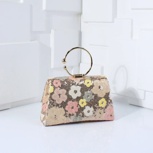 Metal Top Handle Clutch with Sequins & Flowers | Versatile Chain Shoulder Bag for Women